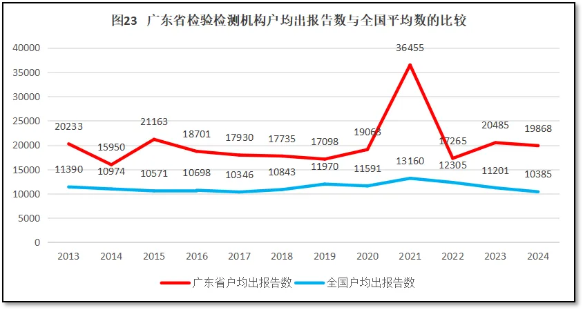 2024年度,广东省检验检测机构户均出具检验检测报告19868份,是全国平均水平10385份的1.91倍,全国排名第2,较2023年提升1位。从2013年以来,广东省检验检测机构户均出具检验检测报告数量与全国的比较如图23所示。